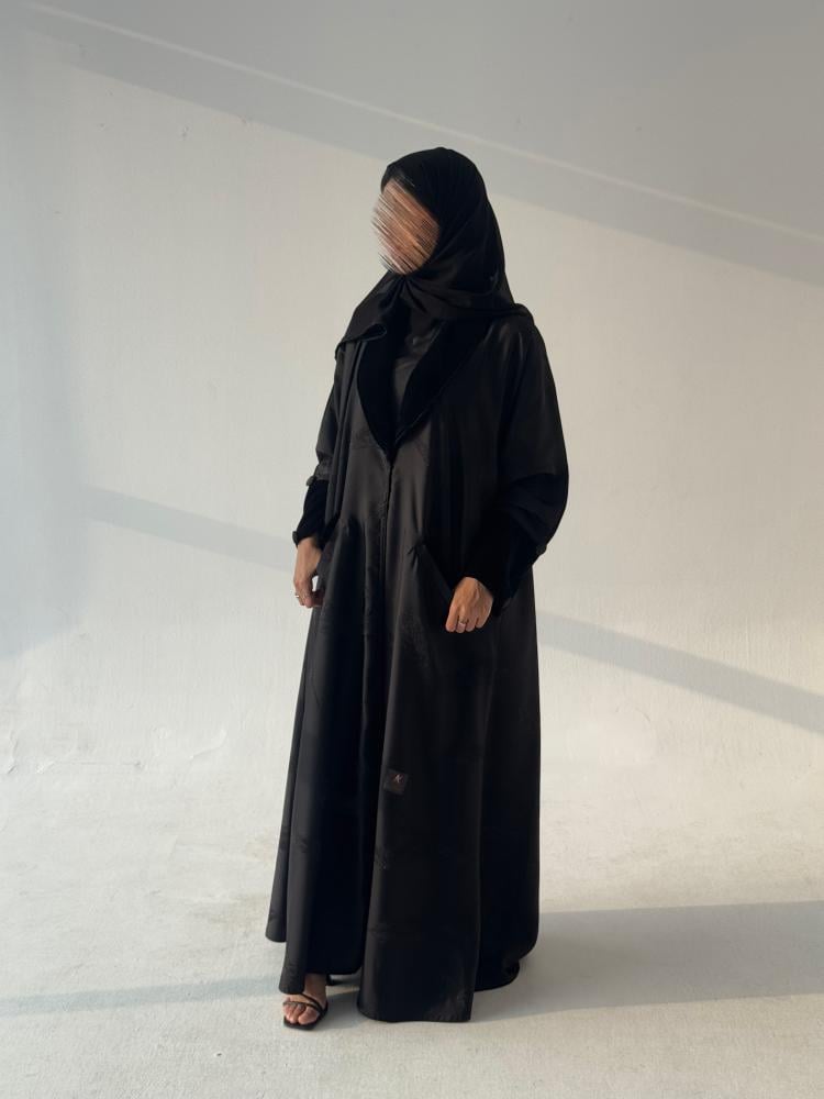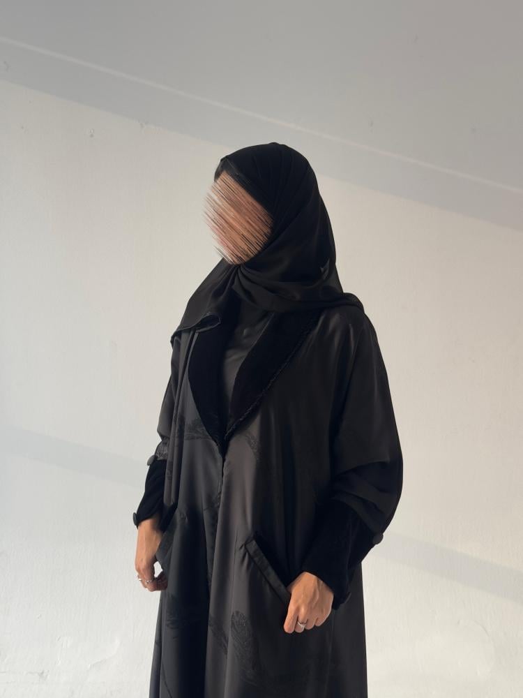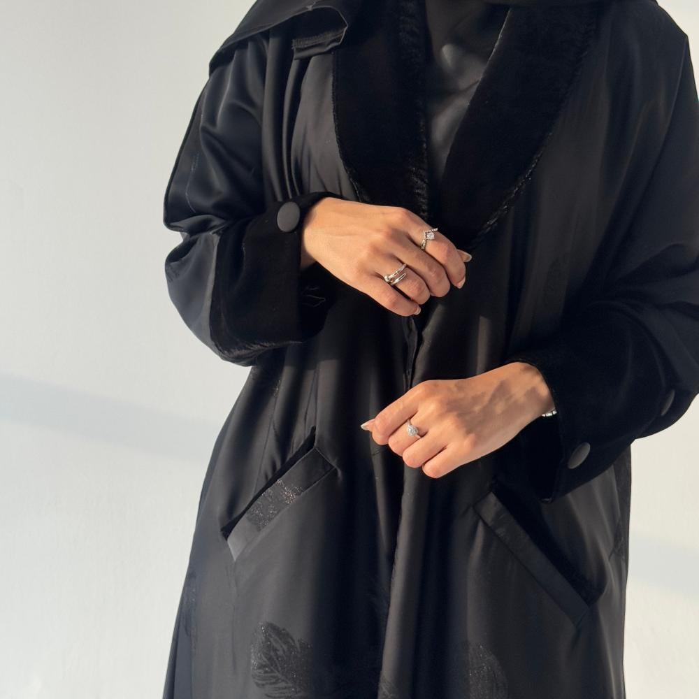 - المخمل الأسود يضيف لمسة من الفخامة ويكمل المظهر العام للعباية بشكل رائع.